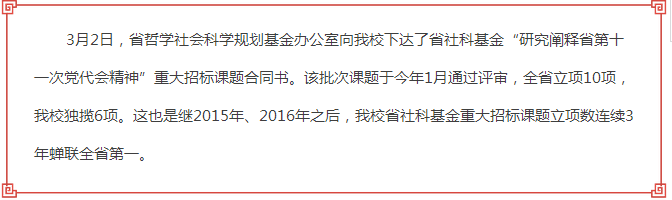 此次招标,公司共申报9项,获准立项6项,立项率高达66.67%。立项项目中,商公司刘长庚教授、楚尔鸣教授、陈湘满教授、周建军教授各1项,法公司欧爱民教授1项,旅游管理公司阎友兵教授1项。课题涉及经济学、法学、旅游管理等湘大特色优势学科,研究内容涵盖“一带一部”发展定位、“三个着力”“四大体系”“五大基地”、经济改革、依法治省等事关我省改革发展重大理论问题和重大现实问题的研究阐释,具有重要的决策参考价值和实际应用价值。