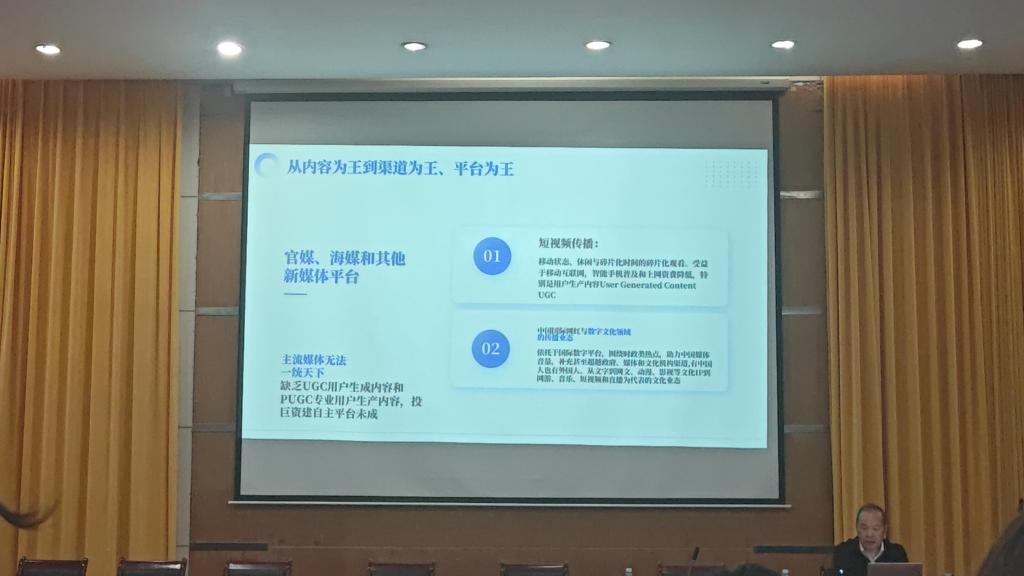 主讲人首先向我们介绍了国际传播的理念,从实践到战略讲述了国际传播到底什么,然后顺应发展趋势,从以内容为王转为渠道为王,平台为王,接着针对外语院系师生在国际传播研究和实务中的主要问题,通过大量亲身经历的实践案例,重点阐述中国故事如何讲、对谁讲、讲什么。最后结合最近几年兴起的大翻译运动,针对涉华翻译中存在的损毁中国形象的讹译损毁,提出打破西方话语垄断,建立国家翻译主权;同时针对外语和传播院系特点,阐述国别传播的重大意义、方法以及区域国别传播和周边传播的研究任务和路径等。