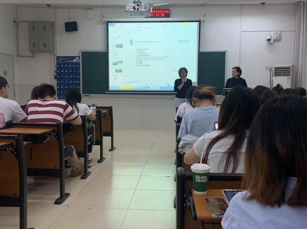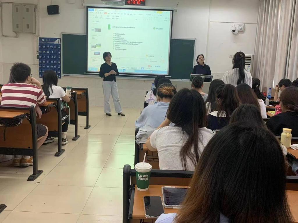 报告上,刘教授首先对《隐墙》这部小说及其作者进行简单的介绍,该书用富于隐喻和象征的寓言化结构、独特的女性叙事,表达对现代文明及生存处境的反思。紧接着刘教授为同学们讲解了电影情节,小说女主面对一堵隐墙,从开始抱有墙会消失的希望到最后实现自我的内心平静,从现代文明生活走向逐渐适应自然的原始生活。然后,刘教授从女性主义等角度多方面进行分析,深入浅出地给同学们进行讲解。女主逐渐脱离了家庭关系,当她面对隐墙,陷入困境,起初感到沮丧,但在与动物们的相处中,她与自然形成依赖关系,不再压抑自我。其次女主的性别在逐渐消解,她不再关注外貌,身体适应男性特点。在电影的高潮,当女主创造的世界被一位男性所破坏时,她毫不犹豫奋起自救,展现了女性自我反抗的独立过程。刘文杰教授多角度解读该电影,使同学们受益匪浅。