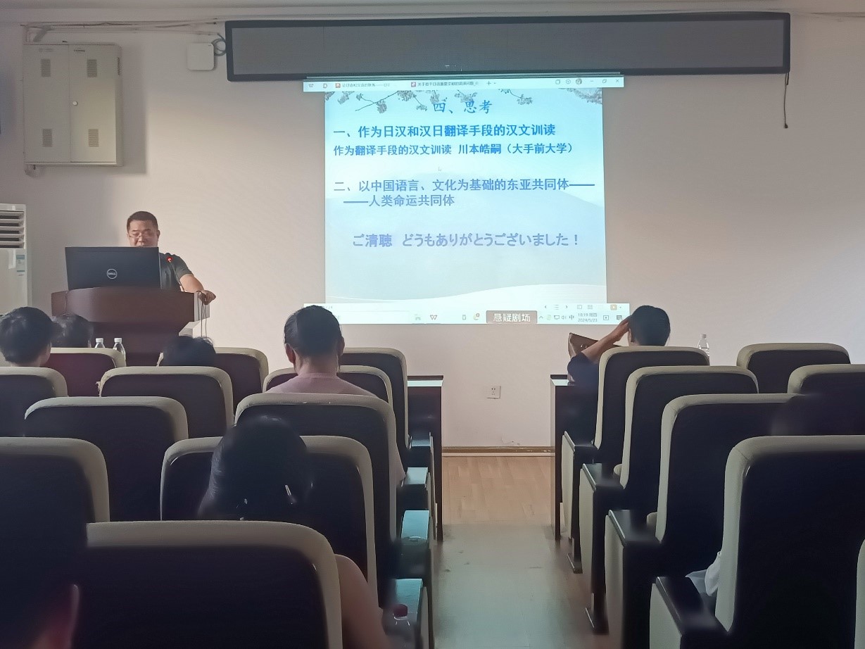 向老师通过实例,从日语的文体类型、已有的翻译归纳和实践以及基于汉字重组的汉日翻译和实践等角度阐述汉语和日语的联系,指出古汉语对日语句法结构的形成和发展产生过巨大影响,汉语和日语在句法上有密切的联系。向老师列举了明治时期的“汉文直译体”,汉语白话文的日译,阐释了文体对日汉翻译的启示作用。