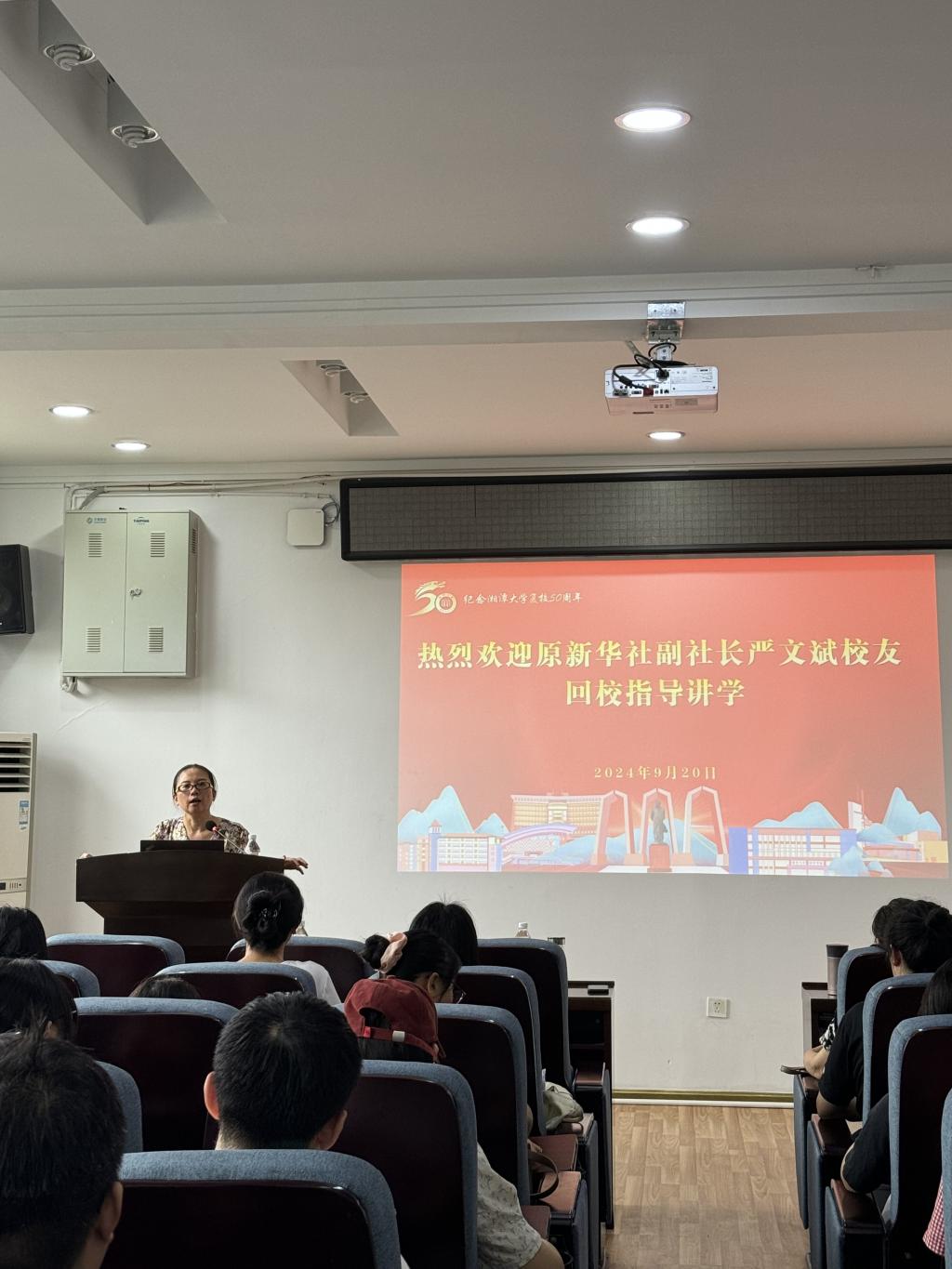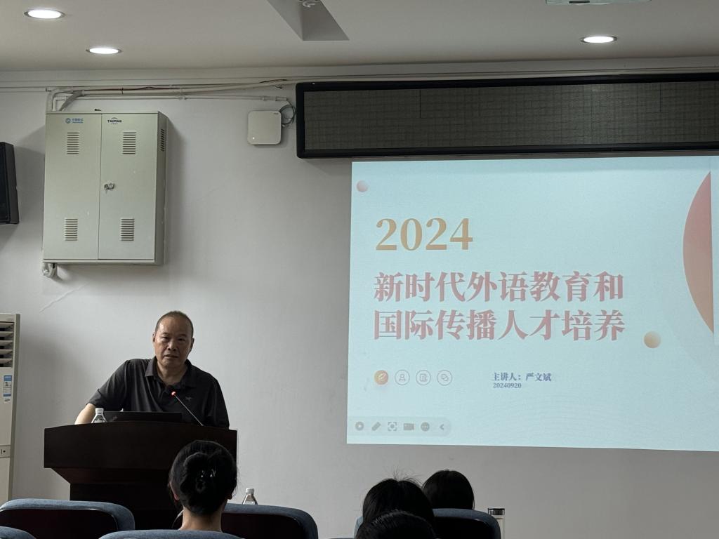 9月20日,著名员工原新华社副社长严文斌教授返回母校谈球吧参加谈球吧复校50周年庆典活动,并赴谈球吧的邀约为外语专业研究生开展学术报告会,报告会议题为新时代外语教育与传播人才培养。此次报告会舒奇志经理担任主持人, 23、24级全体研究生出席。