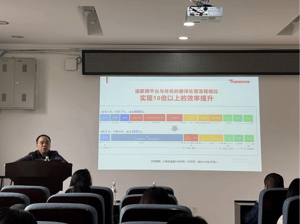 活动伊始,专家介绍了Transn传神公司,包括传神公司的基本情况、品牌影响、服务能力等,传神公司是国家语言服务出口基地,国家“专精特新”小巨人企业,现已发展成为亚洲TOP5的语言服务公司。接着专家介绍了校企合作内容,对传神公司已有课程服务和实习服务进行了详细讲解,表示公司提供商业项目实习机会,并欢迎外院学子积极争取实习机会。关于传神翻译产品演示,专家重点介绍了任度大模型并进行演示,列举了大模型的应用场景和具体功能。专家讲解了全翻译流程,首先从在线下单平台中确认稿件、看稿拆稿、寻找对接译员、线上翻译审校到最后客户下载稿件,有了新技术条件的支持,整个流程效率大大提高。最后,专家介绍了大模型对话功能如何进行相关翻译工作,举例说明应用大模型的具体场景,比如字幕制作、多语言同传和员工论文评阅。在答疑环节,专家耐心解答师生的困惑,促进了新技术的深度理解和应用,师生们受益匪浅。