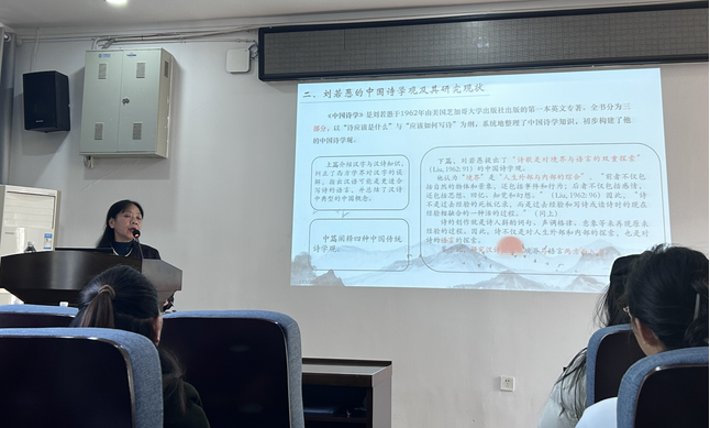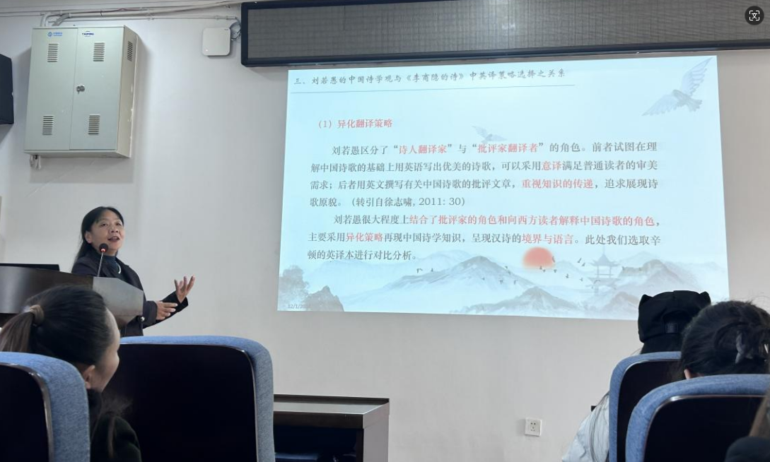 讲座伊始,黄勤教授向老师和同学们介绍了学科前沿的知识翻译学的概念。基于这一本土翻译理论,美籍华裔学者刘若愚,提出了“诗歌是对境界和语言的双重探索”的中国诗学观,并在对李商隐的汉诗英译中践行他的诗学观。在此,黄勤教授介绍了刘若愚的两本英文专著:《中国诗学》与《李商隐的诗》。教授特别强调了前者是刘若愚对中国诗学观的初步构建,后者则是在实践中对其诗学观的进一步阐释,指明了翻译的理论支撑实践、实践推动理论的关系。