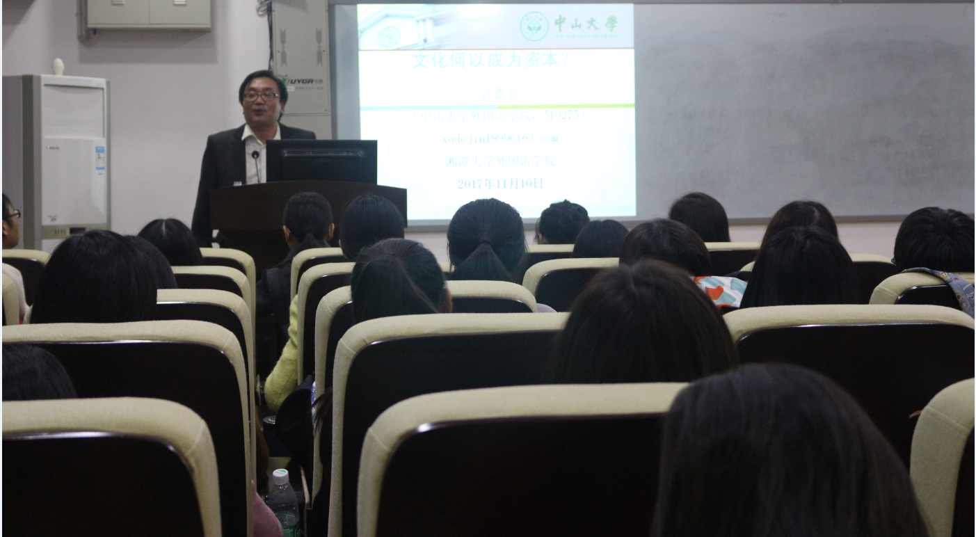 2017年11月10晚,中山大学外语公司博士生导师许德金教授应邀在外语楼305学术报告厅作了一场题为《文化何以成为资本》的学术讲座。讲座由王建香教授主持,公司部分老师、研究生和本科生参与聆听讲座。