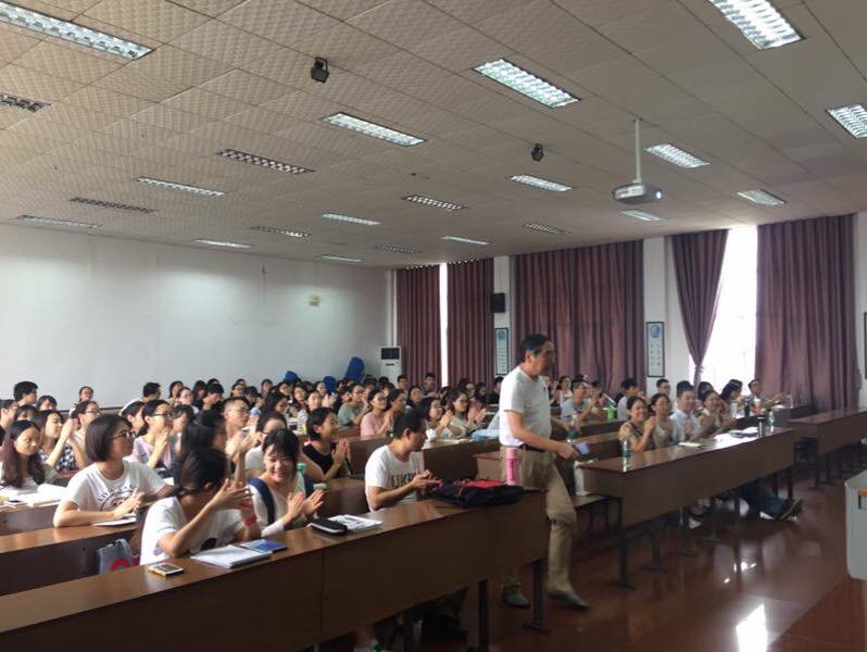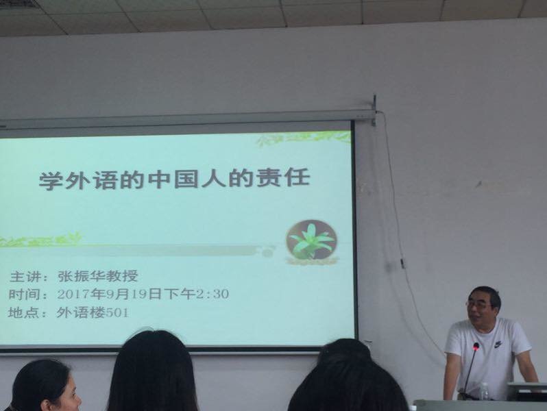 张教授学识渊博,风趣幽默。首先,他向大家分享了他作为一个中国的德语教授在德国的所见所闻,引导大家认识到作为外语学习者的责任:把语言当作一种工具,弘扬中国文化。由此,他向大家介绍了把中国文化传播到外国去的有趣方法,以如何用德语表示“撒娇”为例,讲授了如何妥善处理中国特色词德译的问题,阐明了在跨文化交际中接受理解文化差异的重要性;同时他就外国朋友对中国的褒贬两极化看法提出了自己的见解,各国文化各有不同,但无优劣之分,在与他国朋友交流的同时,应该更加注重学习别人的长处,如德国人民的公德心,法制意识,他倡导各位学子,一定要拥有对自身文化的自豪感,也要反对贬低或者提高某一种文化的沙文主义做法;对比外国的进步之处,他也分享了作为中华文化精髓的“和、中、忠、孝、仁、义、礼、智、信、廉”十个字的德译词,循循善诱,号召各位学子无论身处国内国外,一定要拥有传承与弘扬中华文化的使命感和责任感,扎根于中国五千年博大精深的优秀文化,把中国文化带向世界。