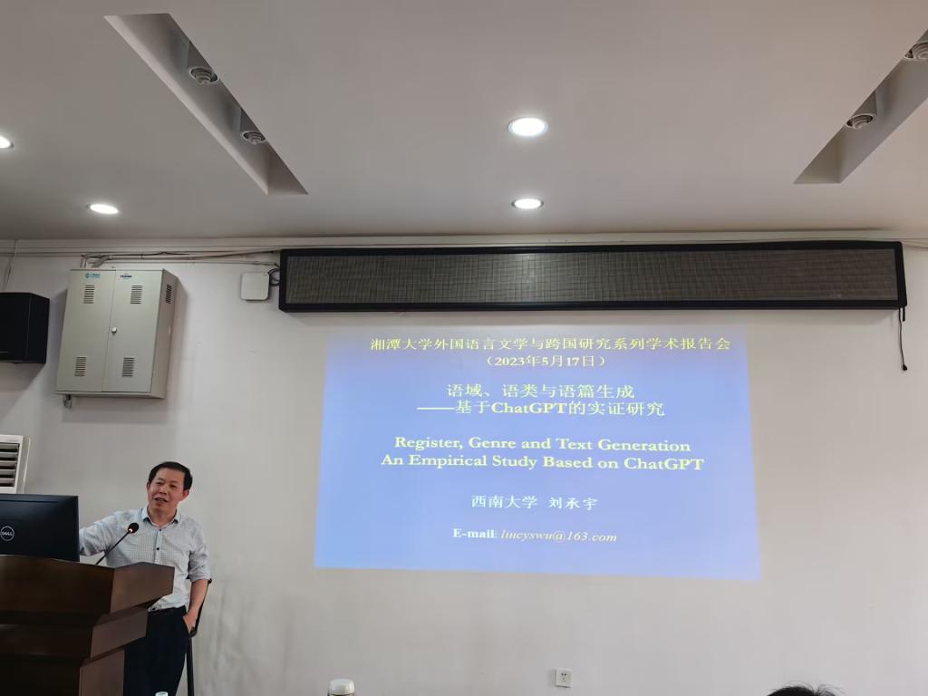 5月17日下午,西南大学谈球吧教授、博士生导师刘承宇教授为谈球吧师生作了题为“语域、语类与语篇生成:基于CHATGPT的实证研究”的讲座。本次讲座在外语楼305报告厅举行,由曾炯巍副教授主持,公司部分师生参加了此次讲座。