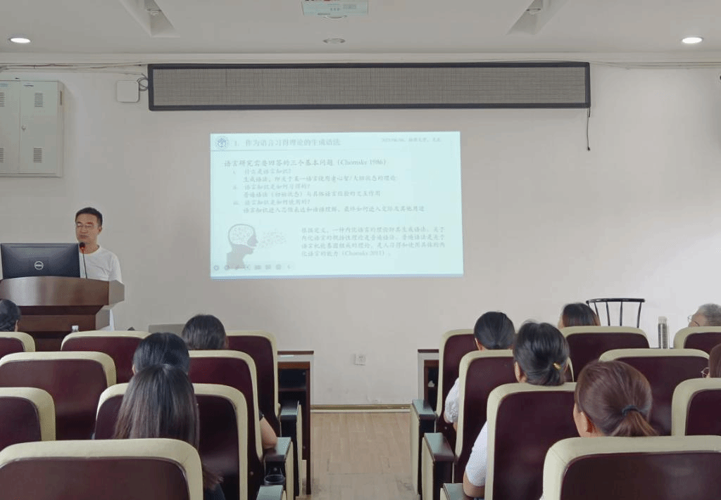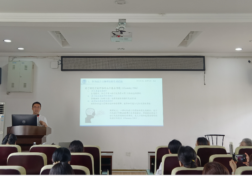 吴庄教授从物种进化等角度论证了儿童生来具有语言习得机制,详细梳理了生成语法七十多年来关于语言习得中输入作用的看法及其演变过程,介绍了生成语法语言习得观的前沿知识和最新研究进展。吴庄教授旁征博引,列举了智人的语言天赋、语言障碍人群和日语母语儿童习得卷舌音等现象,将学术问题讲解得十分生动形象。
