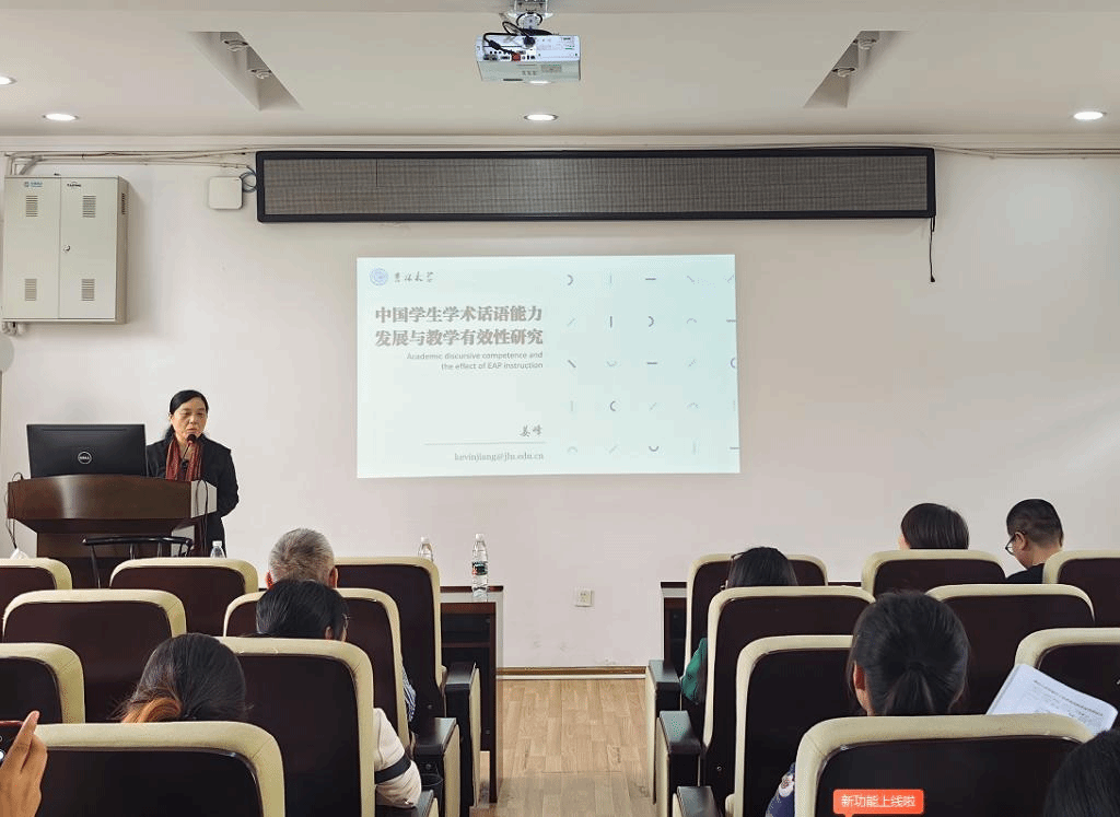 姜峰教授介绍了学术话语这一概念,继而道出现存学术话语方面存在的疑惑与问题,尤其是学术英语方面现存的疑惑与问题,并解构学术话语能力,根据自建对比语料库的统计数据,分析了中国英语学习者学术话语能力的薄弱之处,并以一项实证研究展开报告,分析了学术英语主要教学路径对学术话语能力培养的针对性以及有效性,进而提出了发展本土化学术英语教学的对策和建议。姜教授围绕对前测员工文本和专家文本进行对比,并分析员工文本和专家文本的差异,将前测员工文本和后测员工文本进行对比和分析。姜教授指出学术英语写作教学对员工体裁能力发展提升较大,对员工文本能力社会语境能力也能有所提升。学术英语教学有助于员工参与国际学术交流,对话学科共同体。