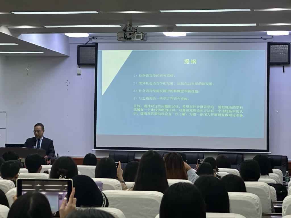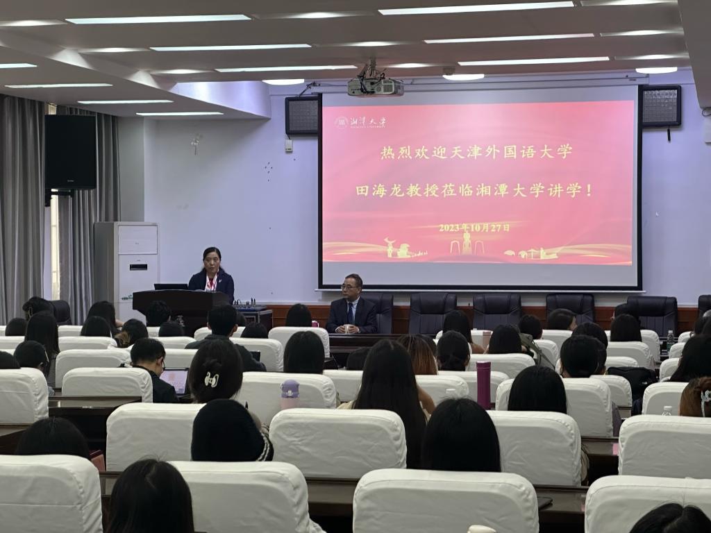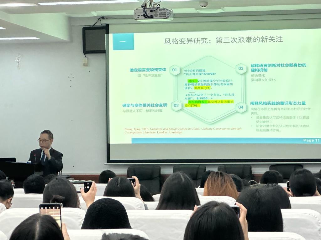 10月27日下午,天津外国语大学博士研究生导师、中国石油大学(北京)特聘教授、中国语言学会社会语言学分会荣誉会长、中国英汉语比较研究会话语研究专业委员会副会长兼秘书长、中国逻辑学会符号学专业委员会副秘书长田海龙教授应邀为谈球吧师生作了一场题为“变异社会语言学新发展中的新概念”的学术讲座。本次讲座由李素琼教授主持,谈球吧120余名师生聆听了本场讲座。