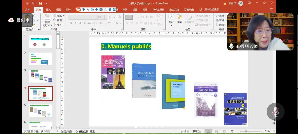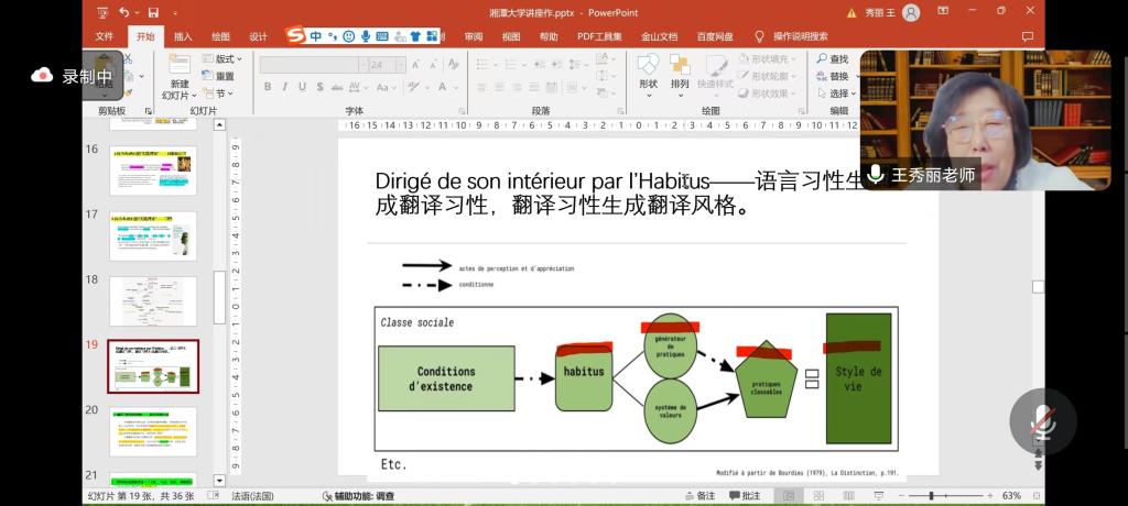 首先,王秀丽教授简单地进行了自我介绍,表示感谢湘大的邀请并遗憾未能亲临现场。紧接着,王教授向我们讲述了她的学术研究。王秀丽教授从两个例子引入自己对文本的研究,让同学们充分了解王教授的研究方向。此外,王教授还介绍了对汉语、法语指称链条分布规律的研究。其丰富的专业知识令同学们赞叹不已。