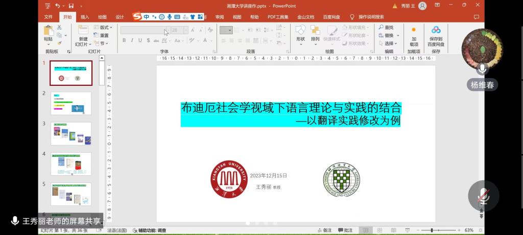 2023年12月13日下午两点到三点半,北京语言大学王秀丽教授在线上开展了题为《布迪厄社会视域下语言理论与实践的结合—以翻译实践修改为例》的讲座。此次讲座结合线上与线下两种形式,线下在外语楼305报告厅举行。线上与线下会议由谈球吧法语系杨维春副教授主持,法语系全体师生参与。