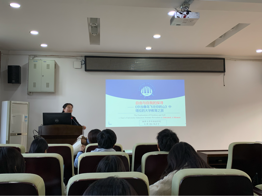讲座分为三部分,第一部分是该篇论文的写作背景;第二部分是论文写作的细节;第三部分是老师员工交流心得。首先吴老师介绍了与她合作这篇论文的19级员工陈彦宇,介绍了这篇论文创作的前期工作。然后介绍了这篇论文的创作原因,细节,国内外研究概况以及国外研究现状。吴老师强调直至2019年才有学者跳出书评的圈子将目光转向回忆录的理论分析,国内外关于这部回忆录的研究都还不够充分,且历来研究者理解的“教育”与作者在剑桥大学和哈佛大学的学习划上等号,所以本篇论文力图从回忆录本身出发,由文本内部向文本外部发散思维,探究“教育”对塔拉的灵魂塑造过程及作用,最终延伸“教育”在当代的文化内涵和社会启示。吴老师还讲述了论文写作过程的修改细节,以目录的修改举例,也鼓舞同学们不要畏难,要有坚毅的决心走好学术道路。最后,吴老师回归“教育”二字,认为教育不是把一个人的一部分完全消灭,只允许另一部分存在,而是包容和接纳他(她)的各个部分甚至更多的自我,使他们相互融合,最终成为一个健全的、完整的、丰富的人。