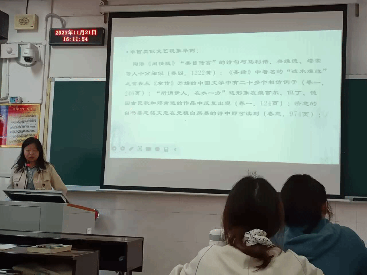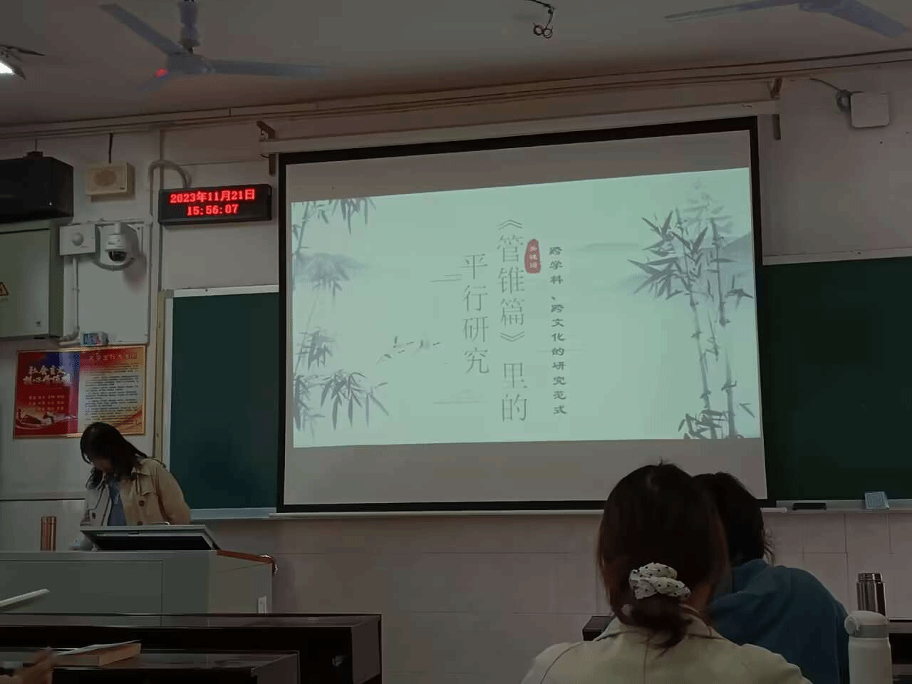 讲座开始唐老师解释论坛选题的原因,通过举例说明无论国内还是国外论文的产出都呈现出来跨文化和跨学科的的趋向。紧接着,介绍比较文学的俩个方法:比较文学研究的影响和比较文学平行研究,比较文学的类型学研究强调“无影响比较”,并且介绍《管锥篇》,其是札记的形式,涉及哲学,史学,语言学,民俗学,修辞学等领域,并不是简单的停留于罗列相识之处,而是通过举例的方式来加深我们对中西文学比较的研究。探讨文学与人类学的结合,把故事情节的相似性往往可以推溯到一系列人类学理论上面。探讨文学与心理学的结合,心理上的情感和感情都会体现在书面上或者口头上。