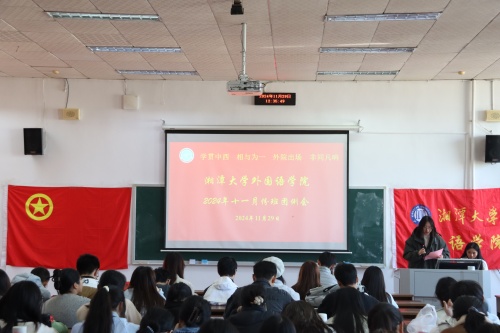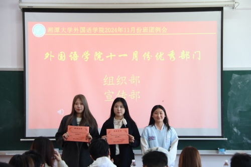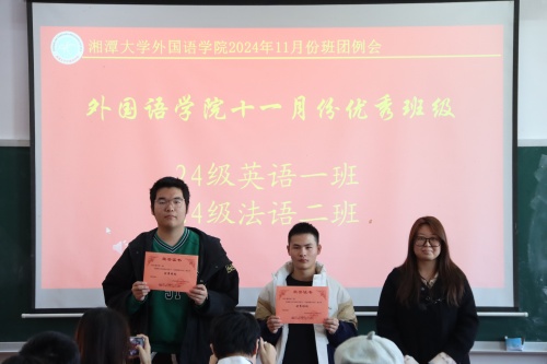 在过去两个月里,也涌现出一批优秀班级。2024级英语一班和2024级法语二班获得十一月份“优秀班级”称号,团委第一副书记杨凯雯为其颁奖。2024级英语一班班长张静和2024级法语二班班长曹斌分别从学习情况、班级活动、班级荣誉和未来工作安排等方面进行了风采展示。
