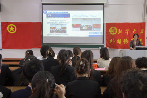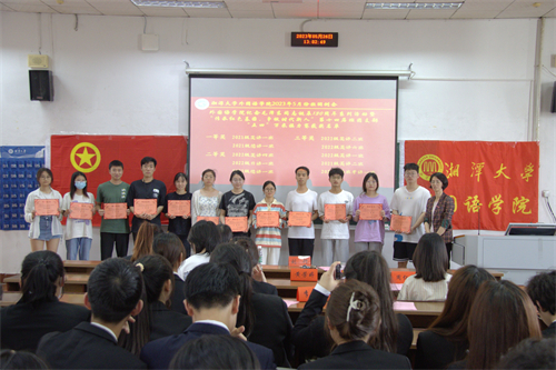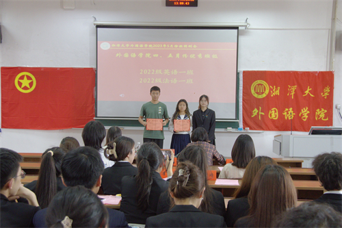 在优秀班级展示环节,2022级英语一班及2022级法语一班的班长以PPT的形式分享了班级管理的工作经验,从思想建设、学风建设等方面展示了积极向上的班级氛围。第二十五届员工会轮值主席李臣炼为上述班级颁奖。