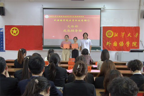 会议伊始,刘行为在谈球吧纪念毛泽东同志诞辰130周年系列活动之“传承红色基因、争做时代新人”第十四届班团支部五四万米接力赛中获奖的班级颁奖。2021级英语一班、2021级德语一班获得一等奖;2022级英语四班等3个班级获得二等奖;2022级英语二班等5个班级获得三等奖;2022级德语二班获得优秀组织奖;2022级法语一班获得最佳风尚奖。