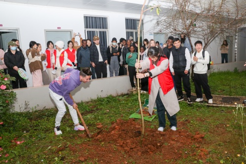 随后,大家先后参观了逸夫楼、第二田径场、画眉潭、图书馆、第一教学楼、员工中心、南苑篮球场以及南校门铜像广场。每到一处,志愿者们都用流利的中英双语进行介绍和讲解,将每一处景点的历史背景、文化内涵以及背后的故事娓娓道来。湘大校园的美景和深厚的文化底蕴让在场员工惊叹不已,纷纷拿出手机拍照留念,记录下这些精彩的文化活动。活动最后,中外职工齐心种下一棵金丝楠木树,表达他们同心合力,共续友谊的美好心愿。