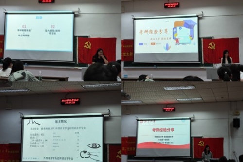 考入厦门大学新闻与传播专业的黄思宇通过PPT和手写整理的PDF资料详细分享了公共课与专业课备考流程。她特别提到,非常乐意与有需要的同学分享考试真题及电子笔记,助力大家精准备考;考取武汉大学英语笔译专业的程宇佳提醒同学们,有考研意向者需密切关注研招网及公司官网发布的招生动态、题型变化等关键信息。她强调,备考过程中“耐性”与“坚持”是上岸的核心要素,大家要调整心态构建稳定的备考节奏;成功考入湖南大学外国语言学及应用语言学的彭清逸以线上视频形式分享经验。她鼓励同学们明确梦想院校并为之持续努力。她强调,备考需制定学习计划、搭建思维导图,以积极心态的心态不断向目标迈进;德语专业的杨双绮成功上岸华东理工大学的英语语言文学专业,她提供了小语种考研经验分享。她特别提醒,择校时需重点关注院校是否压分、是否保护第一志愿等关键信息。针对考研学子普遍面临的“考研与就业”带来的压力,她建议通过体育锻炼、与朋友倾诉等方式及时自我调适,以积极心态应对备考挑战;跨考至广西大学新闻与传播专业的庄影提醒跨考生,复试中导师通常会关注本科专业背景,可能会问到跨考专业与本科专业的关联等问题,建议提前梳理做好准备;成功考入北京外国语大学高等教育学专业的程思雨分享备考心得时提到,可运用费曼学习法深化知识理解,并建议根据自身特点构建专属学习体系。她特别强调“允许一切发生”的心态,认为备考中遇到的挑战皆为合理经历,需以接纳姿态稳步推进复习节奏;考入北京外国语大学的唐振华向同学们分享了国际关系专业正确的备考流程,他建议先从国际关系史入手,再深入学习国际关系理论,最后拓展至政治学理论,遵循从具体到理论的递进路径,帮助理解学科体系;上岸西安交通大学法律硕士专业的徐雨璐通过线上视频分享经验,她以“人生是旷野,不要给自己设限”为主题鼓励学弟学妹打破局限,勇敢追寻目标。