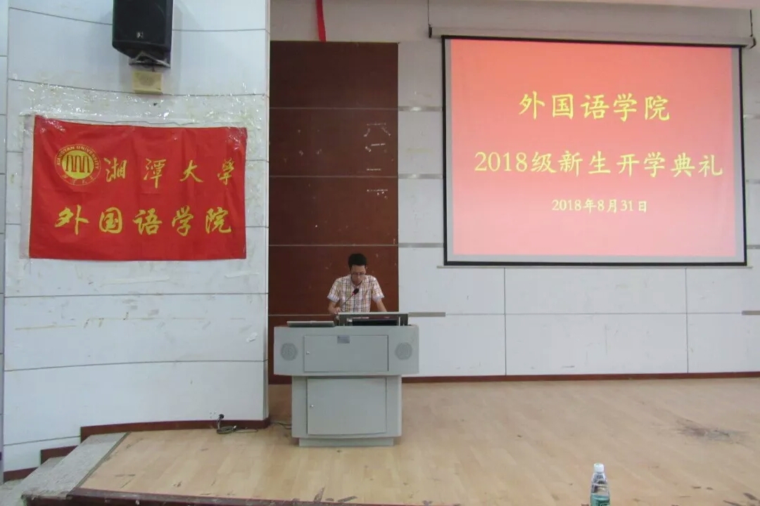 法语系杨维春老师作为教师代表发言,他结合自身学习经历告诉新生们,学海无涯,世间万物均是学问。并激励大家快速转变,迅速融入老员工活;在大学中培养立志、守拙、厚德的优良品德;在学好语言的同时,更要超越语言。