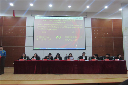 在主席介绍完比赛规则、参赛选手后,双方就辩题正式开始辩论。在正方一辩陈述完后,公司第一位选手,来自15级英语一班的初昕瑞同学,作为反方一辩,首先对对方的观点作出驳论,重新诠释了辩题的定义,来为己方的观点铺陈。紧接着,她罗列出己方观点,有力地抨击了对方观点。第二位出场的是14级翻译班的赵垠垠同学,她淡定冷静,在陈述完观点和回击对方的观点后,虽时间已剩不多,但仍从容自信地回答了对方的质询。双方在唇枪舌剑的激烈交锋中,流利地道的口语和独辟新径的观点令在场的观众连连称赞不已。