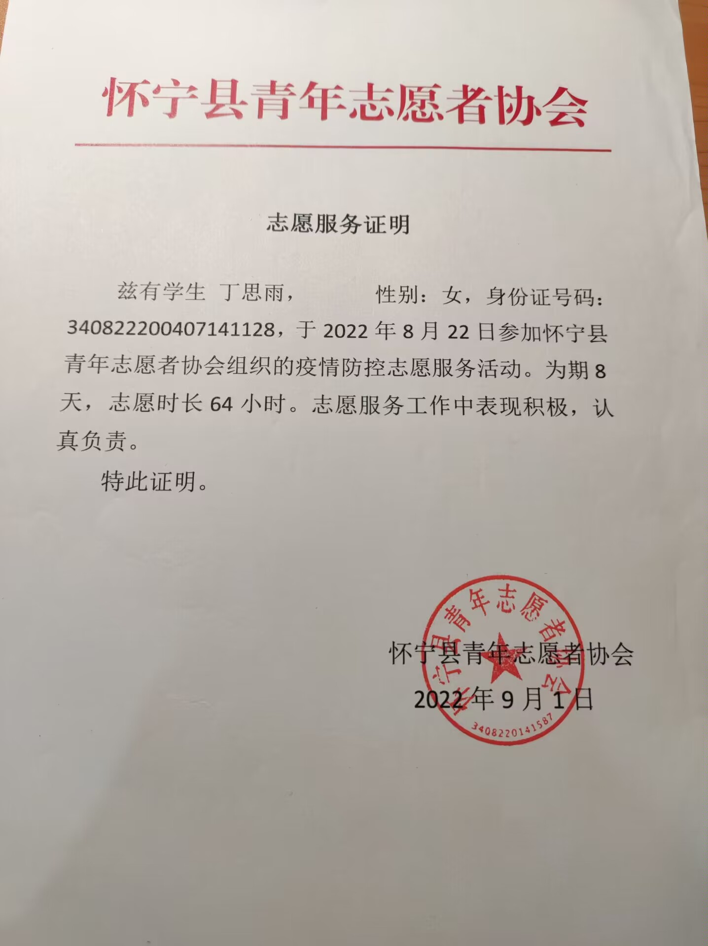 作为一名青年老员工,公司丁思雨同学在暑假期间加入家乡青年志愿者协会,与其他志愿者一起抗击疫情,保护群众。在她的社区因为疫情而进入居家隔离阶段时,她帮助居民购买物资,最大程度的满足他们的生活需要。在核酸检测、秩序维护、信息登记、防疫宣传、物资配送、样本转运等各项防疫志愿服务工作中,丁思雨同学也积极响应,用一言一行传递着疫情无情,人间有爱的温度,最终社区风险等级变为低风险,居民生活也恢复正常。