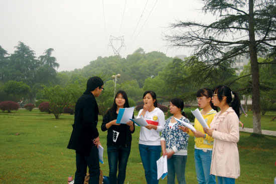 紧挨“俱乐部”,是优美的泽园,杨柳依依,绿草茵茵,亭台座座,紫红的杜鹃朵朵绽放。在这里,学子晨读的身影随处可见,有的独自站在树下默读,有的在草坪上围一圈朗读,有的坐在长廊上看书……蔡小平,化学专业大二女生,是“爱秀俱乐部”教练。这个俱乐部有个约定:每天6时30分,会员要风雨无阻按时前来朗读英语,如果有谁迟到,要“惩罚”做俯卧撑。蔡小平介绍,教练除了教学员朗读技能、演讲水平外,还要帮扶“内向”员工提高自信心,培养良好学风。目前“俱乐部”已有800名会员,以大一员工居多。