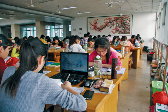 第四、五层阅览室,几乎座无虚席。我们蹑手蹑脚走进去,只见窗台上摆满了同学们喝水用的杯子。看书、看资料、看杂志的同学全神贯注,鸦雀无声。有的用电脑敲笔记,有的用纸笔记笔记,看累了,就在桌上趴一会儿。
