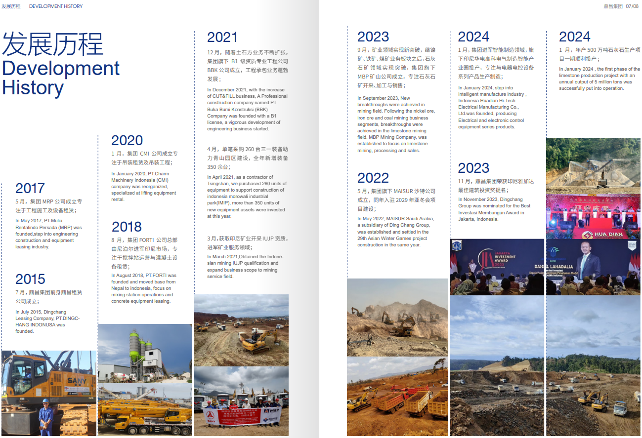 鼎昌集团是一家以提供工程装备一站式服务为主的集团化公司,隶属于鼎昌国际发展有限公司,集团创立发展于东南亚新兴经济体印度尼西亚的崛起浪潮之中,致力于打造全球工程装备领域一站式服务标杆品牌。经营范围覆盖工程装备销售、工程装备租赁、工程施工、矿业服务、装备维修与技术服务、零配件及物资贸易等领域,是印度尼西亚起步最早、发展速度最快、设备种类最齐全、合作方式最多元的外资工程装备服务企业。业务布局已延伸至印尼、中国大陆、香港、泰国、尼泊尔、沙特阿拉伯等地。