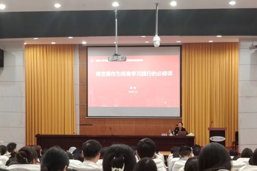 胡阳以“将党章作为终身学习践行的必修课”为主题进行授课。从“学习贯彻党章:合格党员第一位要求”“‘纲章合一’的党章结构与党章修正”“党员标准的嬗变与现行党员规范”“对照党章检视自己的理想信念和思想言行”四个方面进行了详细阐述。她首先介绍了党章的地位和作用,强调党章在党的建设和国家发展中的核心地位。她指出,党章是党的根本大法,是全面从严治党的总依据和总遵循,也是全体党员的总规矩和总遵循。接着,胡阳细致讲述了党章的修正历程,教育学员们应该学习党章的历史沿革,并结合党章对党员的规范阐述了党员必须履行的义务。最后,她强调,全体学员要对照党章检视自己,并要求全体学员坚定理想信念,加强党性修养,做对党忠诚的表率;树立群众观念,保持为民情怀,做为民服务的表率;增加敬畏之心,坚守底线红线,做遵规守纪的表率;练就过硬本领,夯实发展根基,做德才兼备的表率;树立远大志向,投身强国伟业,做堪当重任的表率。