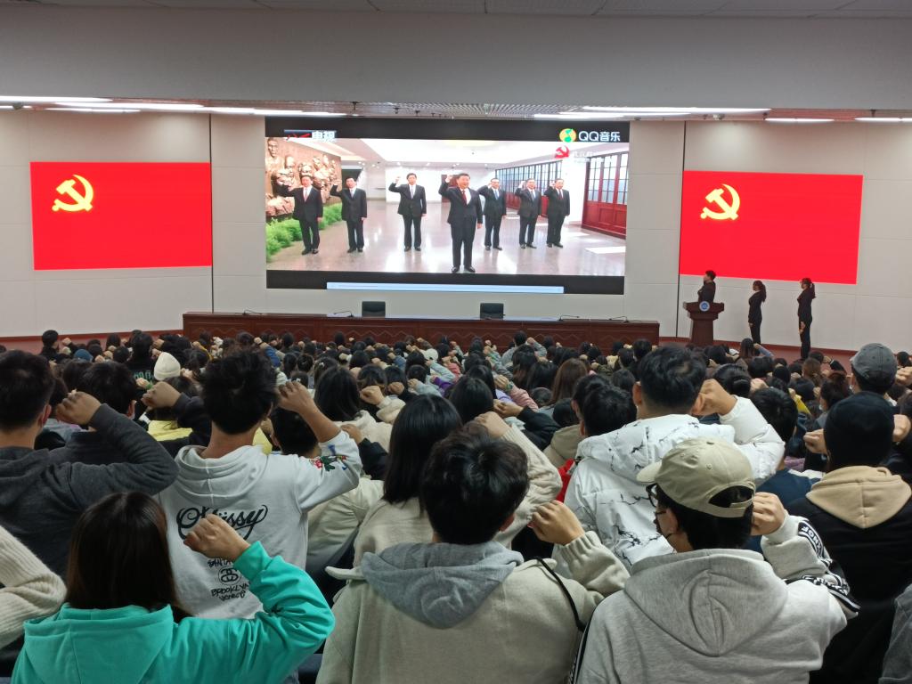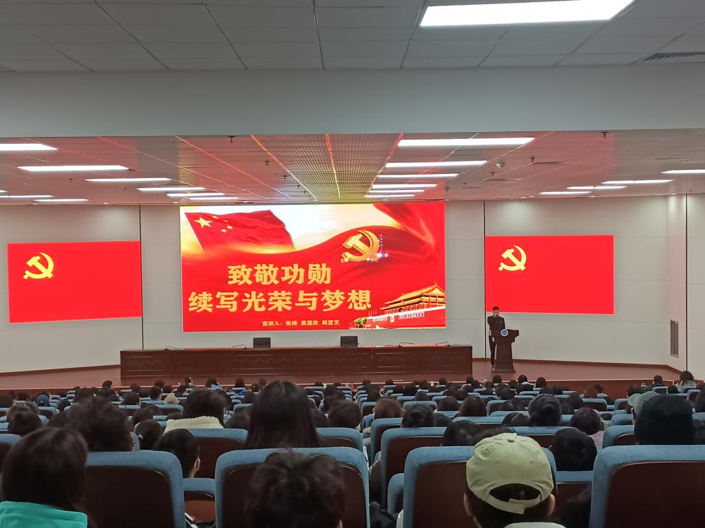 本次宣讲以“致敬功勋,续写光荣与梦想”为主题。张博带领大家了解了“五章一簿”的内容,介绍了中国共产党党徽和党员徽章的含义,指出人民的利益高于一切,共产党员应该全心全意为人民服务。黄嘉欣分享了“七一勋章”获得者李宏塔、张桂梅两位人物的故事。“革命后代”李宏塔艰苦朴素的优良家风、服务群众的为民情怀,“董事长妈妈”张桂梅用生命办学、尽自己最大的努力为别人点一盏灯的人间大爱让全体学员肃然起敬。周萱芝采用视听结合的方式讲述了“共和国勋章”获得者张富清朴实纯粹、淡泊名利的不凡人生,申纪兰首倡“男女同工同酬”、首次当选并连任十三届全国人大代表的故事。张博总结道,我们应该致敬功勋,学习他们的品格,传承他们的精神。惟有崇尚英雄才能产生英雄,争做英雄才能英雄辈出!最后,全体学员起立,举起右拳齐唱入党誓词歌《我宣誓》,学员们坚定的目光和紧篡的右拳彰显了他们对党的热爱与向往。