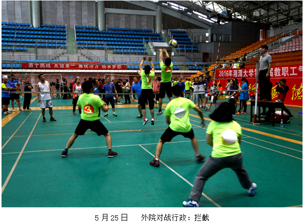 5月26日晚上,公司与马院对决。比赛一开始,公司队员显得有些匆忙和急促,发挥不是很好,发球与接球失误颇多,失去了第一局的比赛。第二局,公司调整了状态,“一传,二抛,三扣”,默契十足,士气大增。比分数次扳平,越打越激烈。公司的啦啦队也全身心地投入到比赛中去了,不遗余力地为他们加油鼓劲;掌声、喝彩声响彻4号球场大厅。公司队员越战越勇,以2:1赢得了这场比赛。