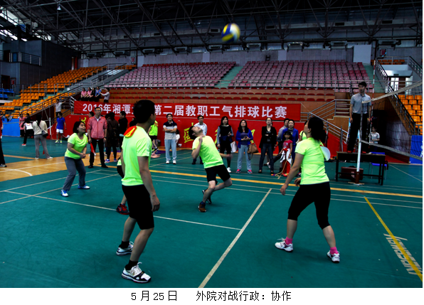 5月25日,公司对战行政队。比赛初始两方都不熟悉场地,各自都有失误,但随着比赛的进行,场上的运动员们渐渐打开了,不时有精彩的扣球、绝妙的吊球、惊险的救球而引来观众的阵阵惊呼与掌声。最终这场比赛公司以0:2输了,但他们却打出了士气,打出了外院不服输的气势。
