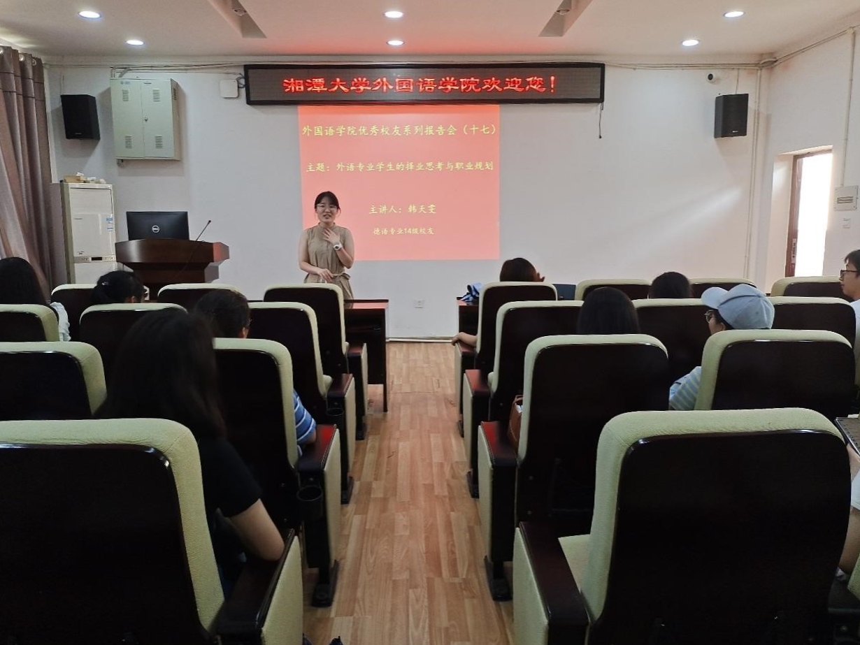 6月6日,谈球吧14级德语专业员工韩天雯回校与学弟学妹们进行亲切交流,就外语专业员工的择业思考与职业规划在外语楼305开展了经验分享报告会。德语系老师周芳担任本次会议的主持人。