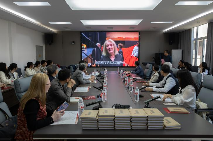 研讨会正式开始之前,2022年诺贝尔文学奖得主、法国著名作家安妮·埃尔诺以视频形式向吴岳添教授致以诚挚祝福,她真诚地祝愿吴岳添教授“人生海海伞寿安康,岁月悠悠福泽绵长”。作为安妮·埃尔诺名作《悠悠岁月》的最早中译本译者,吴岳添教授和作者的渊源可以追溯到2008年。早在本世纪初的2002年,人民文学出版社和中国外国文学学会联合设置“21世纪年度最佳外国小说奖”这一奖项,开中国人向外国作家作品颁发文学奖之先河。《悠悠岁月》2008年获颁此奖,吴岳添教授作为法国文学评选委员,高度肯定并赞扬了作者的小说创作艺术,认为艾尔诺创造性地发明“无人称自传”这一新体裁,创作了这部被称为“社会自传”的杰作,忠实地记录、阐释并唤醒了一代人的集体记忆,以此对抗岁月的流逝和记忆的淡忘。这充分体现出吴岳添教授敏锐的学术眼光和深刻的学术洞察力。吴岳添教授的优美译笔与原作极具特色的体裁、格式、语言之间的“碰撞”,铸就了《悠悠岁月》这部翻译文学经典,也掀起了国内安妮·埃尔诺研究的热潮。也正是这份文学创作和译介的缘分,使得两位跨世纪老人互引为知己。吴岳添教授向安妮·埃尔诺赠送了《悠悠岁月》的中译本和湖南湘绣,艾尔诺也向吴岳添教授回赠了法国伽利玛出版社新版的《悠悠岁月》原著并亲笔题词,感谢吴岳添教授的译作“把这些既是法国的也几乎是世界的岁月带到了中国。”吴岳添教授向安妮·埃尔诺发出邀请,邀请她在适当的时候前来中国走访交流,艾尔诺女士欣然应允,表示将在时机成熟时来华交流访问。此后,双方保持经常性友好通信,续写中法两国学术和文化交流的友谊。