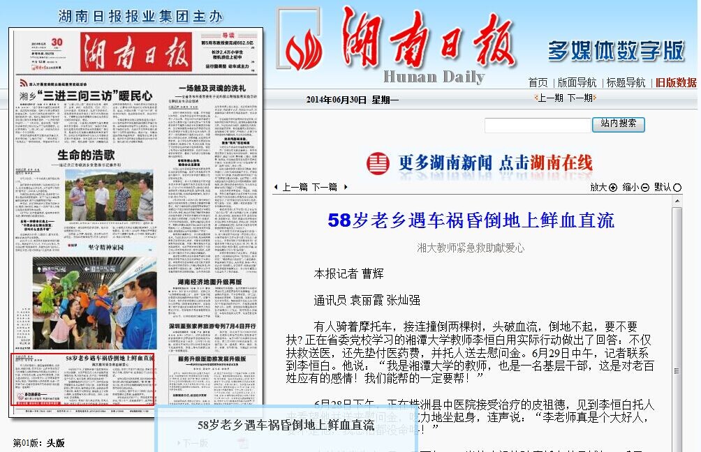 《湖南日报》6月30日在头版发表通讯《58岁老乡遇车祸昏倒地上鲜血直流 湘大教师紧急救助献爱心》,讲述了李恒白紧急救人的全过程,并在7月3日3版刊发后续报道《社会需要“李老师” 湘大救人教师李恒白事迹引起强烈反响》。