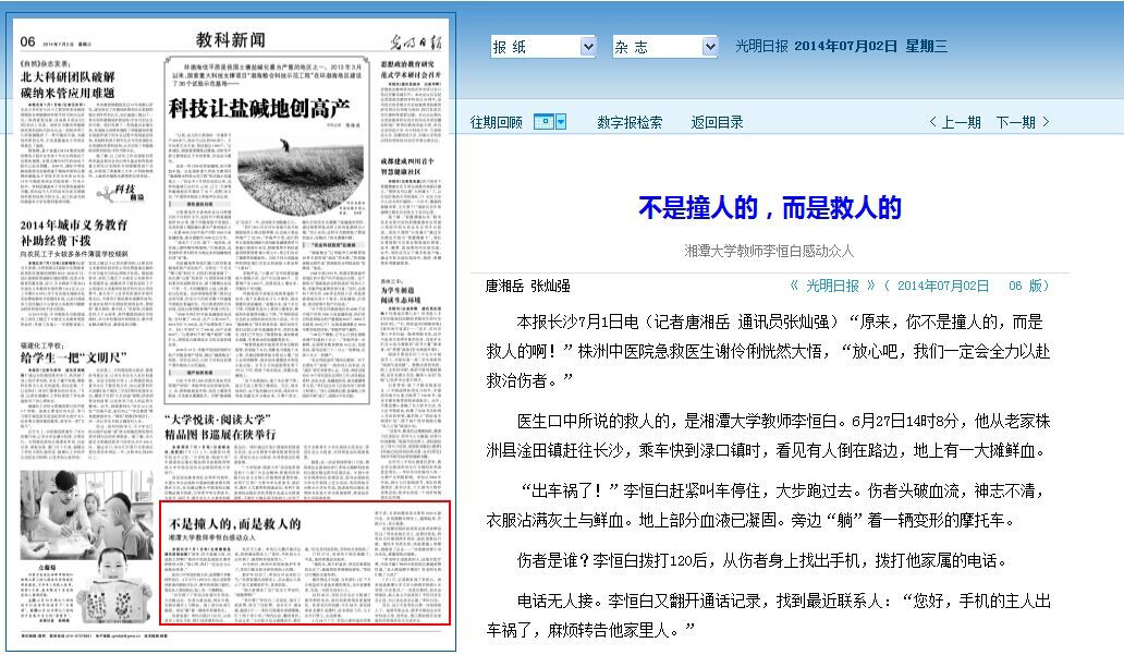 《光明日报》于7月2日刊发了1100字的消息《不是撞人的,而是救人的 谈球吧教师李恒白感动众人》,展现了李恒白作为一名共产党员的责任与担当,体现了一名高校教师的“德高为师,行为世范”。