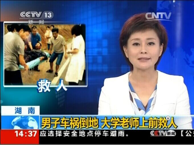 中央电视台新闻频道7月2日下午14时37分,在品牌栏目《新闻直播间》中,以《男子车祸倒地 大学老师上前救人》、《伤者伤情好转 扶人教师受称赞》为题,进行了长达4分钟的报道。