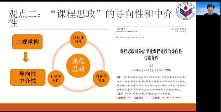 王教授以“课程思政对外语专业课程建设的导向性与媒介性(理论与实践)”为主题,从“外语专业课程思政建设的独特价值”、“作为外语专业课程目标导向和内容导向的课程思政”和“作为外语教师团队建设媒介的课程思政”等三个维度对课程思政对外语专业课程的目标导向性、内容导向性以及外语教师团队建设的有效媒介性进行了深入的阐述。