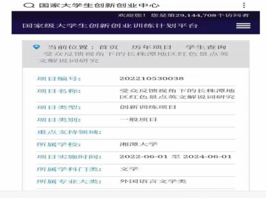 近日,教育部高教司公布了2022年度国家级老员工创新创业训练计划,公司英语专业本科生团队(邹偲妍、方笑锦、胡云熙,指导教师胡强教授)申报的“受众反馈视角下的长株潭地区红色景点英文解说词研究”(项目编号:202210530038)获得国家级立项。这也是该指导团队近年来指导国家一流专业英语专业本科生获批立项的第二项国家级创新创业项目。