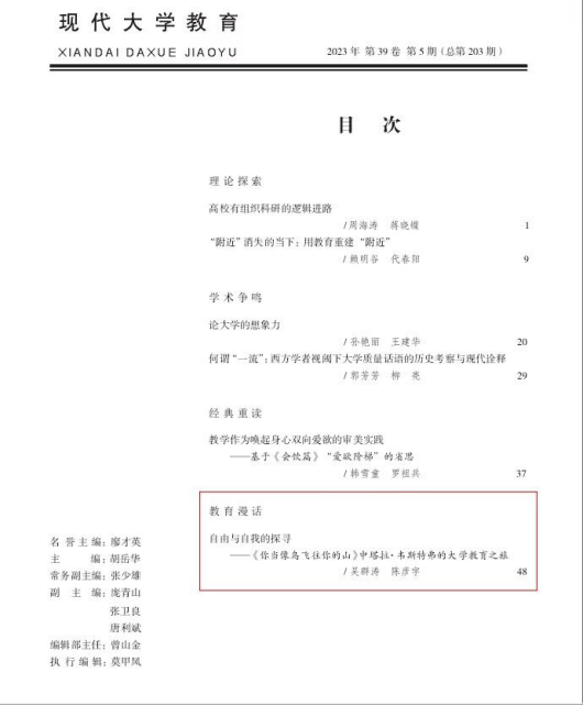 公司教师吴群涛博士和19级汉语国际教育专业本科生陈彦宇合作撰写的论文《自由与自我的探寻——<你当像鸟飞往你的山>中塔拉·韦斯特弗的大学教育之旅》刊载中南大学主办的“三核期刊”(CSSCI来源期刊,全国中文核心期刊和中国人文社会科学核心期刊)——《现代大学教育》2023年第5期。