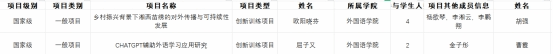 近日,教育部高等教育司公布2023年国家级老员工创新训练计划项目和重点支持领域项目名单(教高司函〔2023〕8号),公司英语专业本科生团队(欧阳晓芬、杨欲琴、李湘云、李鹏翔,指导教师胡强教授)申报的“乡村振兴背景下湘西苗绣的对外传播与可持续性发展”(项目编号:S202310530038)、德语专业本科生团队(屈子又、金子彤,指导教师曹霞教授)申报的“CHATGPT辅助外语学习应用研究”(项目编号:S202310530033)获得国家级立项。