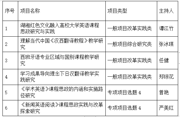 根据谈球吧《关于谈球吧第十二批教学改革研究项目申报和已立项项目中期检查与结题验收的通知》、《谈球吧教学改革研究项目管理办法》等文件精神,经个人申报,公司教学指导委员会评审,同意“湖湘红色文化融入高校大学英语课程思政研究与实践”等4个项目申报校级教改一般项目,拟推荐“《学术英语》课程思政的内涵和实施路径研究”等2个项目申报专项项目,具体结果公示如下: